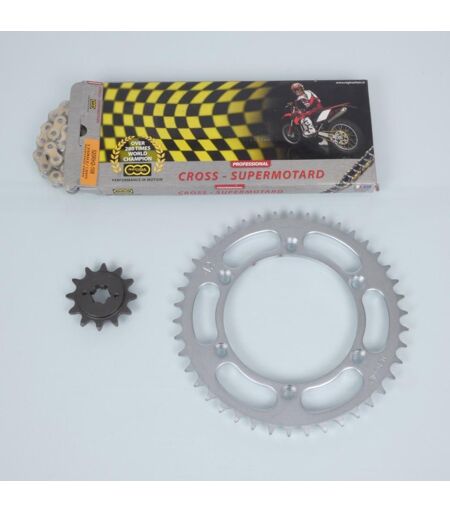 Kit chaîne de transmission complet neuf (démultiplication différente de l'origine). Ce kit chaîne comprend : - Une couronne en acier de 42 dents, alésage 125mm, 6 trous Ø8.5mm entre axe 145mm. - Un pignon de 12 dents, équipé de 2 trous filetage M5 pas 0.80 standard entre axe 30mm. - Une chaîne sans joints toriques hyper renforcée Regina 135RH2 108 maillons au pas 520. - Une attache rapide type 26. Vendu à l'unité. Livré conforme à la photo. ...