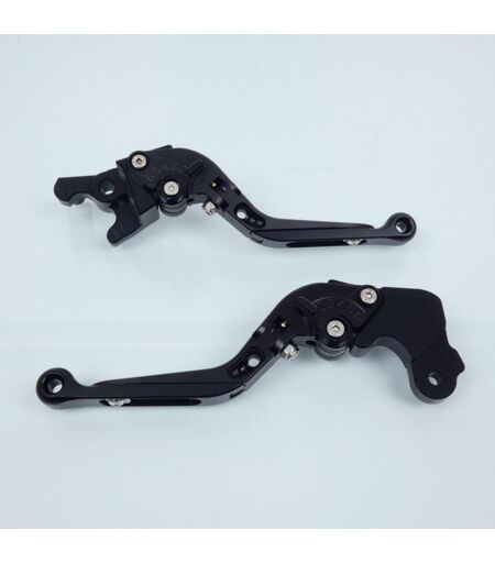 Leviers de frein avant et d'embrayage articulés neufs de marque Sifam, en aluminium coloris noir. Caractéristiques : - Fabriqués en aluminium T6066 CNC taillé dans la masse et anodisé. - Réglage d'angle d'ouverture (6 positions). - Réglage de la longueur (version 3 doigts extensible sur +/- 30mm). - Articulation du levier : repliable en cas de chute. - Personnalisation couleur possible, kit embouts + molettes (vendu séparément). Vendus par paire. Livrés conformes à la photo. ...