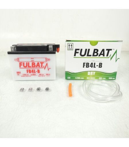 Batterie 12V 4.2Ah(20H) de marque FULBAT référence 'FB4L-B' neuve LIVRÉE SANS ACIDE. Dimensions: - Hauteur totale: 92mm. - Largeur: 70mm. - Longueur totale: 129mm. - Longueur hors trop plein: 120mm. - Hauteur hors couvercle de coloris noir: 71mm. - Tension: 12V. - Capacité: 4.2Ah. - CCA: 56A. - Bornes + à droite. - DIN 5041. Vendue à l'unité sans acide. Livrée conforme à la photo. ...