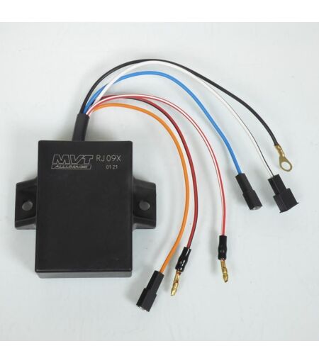 Calculateur digital numérique multicourbes neuf de marque MVT modèle RJ09X Digimax 7 équipé de 6 fils prévu pour allumage MVT Millenium EXT119 et EXT120. Ce diagramme numérique (boitier CDI) remplace le diagramme analogique livré avec l'allumage MVT Millenium. Il permet de passer d'un allumage analogique à un allumage digital (meilleures performances à tous les régimes) et propose 3 courbes d?avance numérique avec 3 possibilités de réglage chacune (18 possibilités). Vendu à l'unité. Livré conforme à la photo. ...