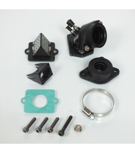 Kit admission Oversize neuf de marque Stage 6 modèle Vulcanise (S6-3214000) comprenant boîte à clapet et pipe d'admission racing. Le kit boite à clapet Stage6 permet un gain de puissance sur toute la montée en régime du moteur. Cette boite à clapet améliore le remplissage du moteur pour des performances élevées. Contient une boîte à clapets vulcanisée avec pipe d'admission en aluminium munie d'une arrivée d'huile et dépression, des joints avec des lamelles en fibres de verre et deux systèmes venturi d'ouverture de 24 et 26mm. Le raccord de pipe en caoutchouc (adaptable pour Dellorto et Arreche de 17,5 à 21mm) de la boîte à clapets peut être modifié au cas où vous changez le carburateur pour un plus grand diamètre, cela évite de changer la pipe d'admission au complet. Dimensions: - Entre axe fixation manchon de carburateur : 60mm - Diamètre intérieur manchon souple : 24mm et 35mm Vendue à l'unité. ...
