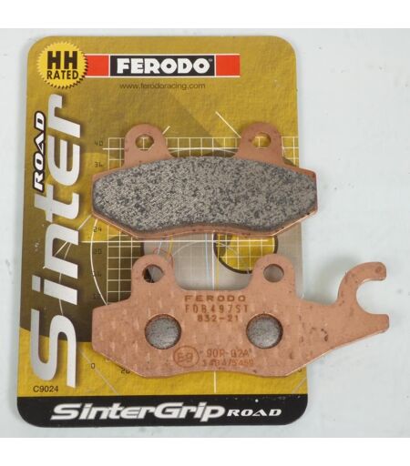 Plaquette de frein Métal fritté neuve de marque FERODO qualité Sinter Grip Road (ST). Dimensions plaquette 1 : - Longueur : 76.9mm - Largeur : 41.9mm - Épaisseur : 8mm Dimensions plaquette 2 : - Longueur : 96.6mm - Largeur : 41.9mm - Épaisseur : 8mm Caractéristiques principales: - Composé de métal fritté présentant les performances de morsure et de freinage les plus élevées de tous les matériaux de la gamme des plaquettes de route FERODO. - Coefficient de frottement le plus élevé (µ) dans la plage des plaquettes route - Indice de frottement le plus élevé possible - Fonctionne aussi bien dans des conditions humides que sèches - Convient uniquement aux disques en acier inoxydable - Convient pour une utilisation avec les systèmes ABS Vendues par paire. Livrées conformes à la photo. ...