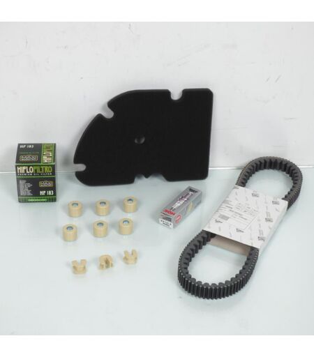 Kit révision entretien neuf de marque Sceed42. Ce kit comprend: - Bougie d'allumage NGK MR7BI-8 - Filtre a air Cif 113.011772 - Filtre a Huile Hiflofiltro HF183 - Galet rouleau de variateur origine CM294902 (21x17mm x 14grs) - Courroie de transmission origine 1A009598 - Guide de variateur origine 1A012092 Ce kit révision permet d'effectuer la révision standard du scooter. Il contient uniquement ce qui est visible sur la photo. Livre conforme a la photo. ...