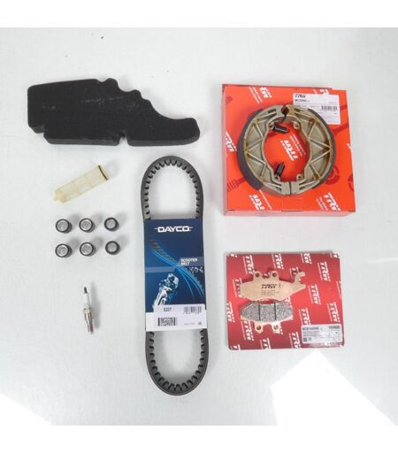 Kit révision entretien neuf de marque Sceed42. Ce kit comprend : - Bougie d'allumage NGK "ER9EH-6N". - Filtre a air origine "8431940P". - Un filtre à huile "431242". - Six galets rouleaux de variateur POLINI "242.088" (19x15.5 x 5.3grs). - Courroie de transmission DAYCO "8207" (756x18mm). - Une paire de plaquette de frein avant en métal fritté TRW "MCB744SRM". - Une paire de mâchoire de frein arrière TRW MCS994 (140x25mm). Ce kit révision permet d'effectuer la révision standard du scooter. Il contient uniquement ce qui est visible sur la photo. Vendu le kit à l'unité. Livré conforme a la photo. ...