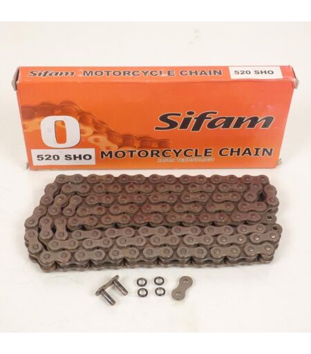 Chaine de transmission Hyper Oring avec joints toriques neuve de marque SIFAM. Caractéristiques: - Pas: 520 - Longueur: 120 maillons - Attache à river Vendue à l'unité. Livrée conforme à la photo. ...