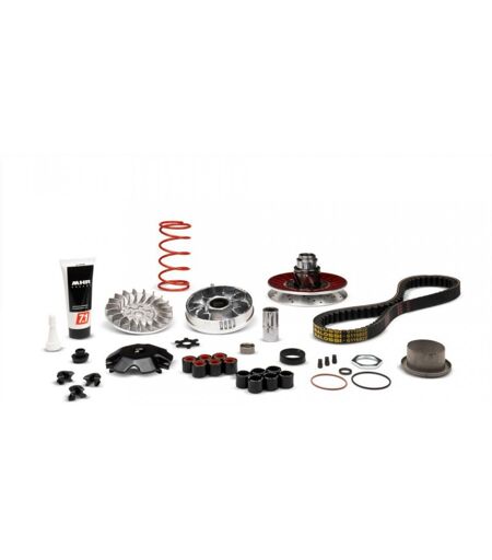 Kit variateur complet neuf de marque Malossi, modèle Over Range MHR Aluminium. Ce kit composé d'un variateur Multivar Over Range MHR Aluminium, d'un correcteur de couple Rear Pulley System MHR Aluminium et d'une courroie de transmission comprend : - Une joue mobile de variateur. - Un plateau d'appui avec ses trois guides. - Une joue fixe de variateur avec son étoile. - Un canon de variateur dimensions 22x13x42.8mm. - Une entretoise de variateur en métal. - Six galets 3.5g dimensions 19x15.5mm. - Six galets 3.8g dimensions 19x15.5mm. - Une poulie fixe de correcteur de couple. - Une poulie mobile de correcteur de couple. - Trois guides de poulie mobile. - Deux entretoises de correcteur de couple. - Un guide de ressort de poussée. - Un écrou. - Deux joints toriques. - Un ressort de poussée rouge 4.7k dimensions 53.7x110mm (diamètre du fil 3.9mm). - Un tube de graisse. - Une courroie ...