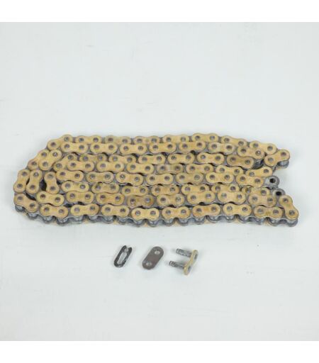 Chaine de transmission neuve de marque Regina (428EB-ORO-136) coloris or. Caractéristiques : - Nombre de maillons : 136 - Pas de chaine : 428 - Qualité : Standard Vendue à l'unité avec une attache rapide. Livrée conforme à la photo. ...