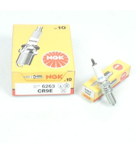 Boîte de 10 bougies d'allumage NGK CR9E neuves. Caractéristiques : - Type de bougie : Standard. - Type de connexion : Embout fileté (sans olive). - Culot diamètre : 10mm. - Longueur filetée du culot : 19mm. - Hexagonal : 16mm. Vendues par boîte de 10. Livrée conforme à la photo. ...