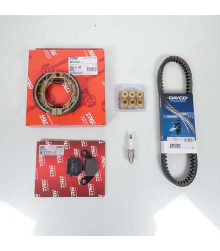 Un kit révision entretien neuf de marque Sceed42 comprenant : - Une bougie d'allumage NGK 'BR7HS'. - Six galets rouleaux de variateur SCEED42 '85.428122' (16x13mm x 9grs). - Une courroie de transmission trapézoïdale crantée DAYCO '7191' (765x17.5mm). - Une paire de plaquette de frein avant organique TRW 'MCB522'. - Une paire de mâchoire de frein arrière organique TRW MCS800 (110x25mm). Ce kit révision permet d'effectuer la révision standard du scooter. Il contient uniquement ce qui est visible sur la photo. Vendu le kit à l'unité. Livré conforme a la photo. ...