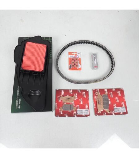 Kit révision entretien neuf de marque Sceed42 comprenant : - Une bougie d'allumage NGK référence 'SILMAR8C9'. - Un filtre a air HIFLOFILTRO référence 'HFA1126'. - Six galets rouleaux de variateur Ø20mm x 15mm x 12.9g LEOVINCE référence '4145'. - Courroie de transmission crantée 937 x 22.7mm MITSUBOSHI référence 'MBLSC065'. - Une paire de plaquette de frein avant en métal fritté TRW référence 'MCB598SRM'. - Une paire de plaquette de frein arrière en métal fritté TRW référence 'MCB806SRM'. Ce kit permet d'effectuer la révision standard du scooter. Il contient uniquement ce qui est visible sur la photo. Vendu le kit à l'unité. Livré conforme a la photo. ...