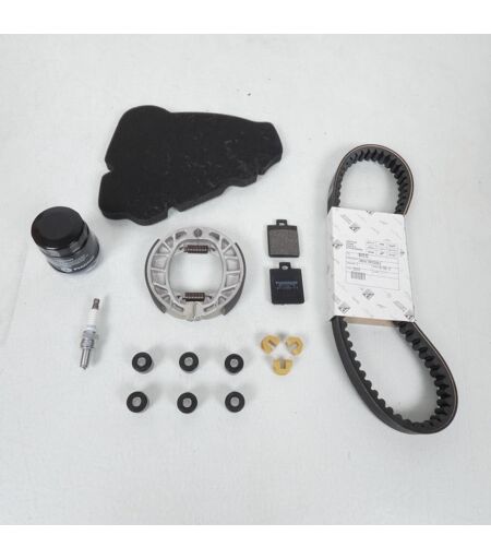 Un kit révision entretien neuf de marque Sceed42 comprenant : - Un filtre à huile origine PIAGGIO référence '82635R'. - Un filtre à air origine PIAGGIO référence '4874010P'. - Une bougie d'allumage NGK référence 'CR8EB'. - Trois guides de variateur origine PIAGGIO référence '4348555'. - Six galets rouleaux de variateur Ø19mm x 17mm x 9g origine PIAGGIO référence 'CM1038035'. - Une courroie de transmission trapézoïdale crantée 814 x 22.5mm x 10.2 origine PIAGGIO référence '841213'. - Une paire de plaquette de frein origine PIAGGIO référence '666574'. - Une paire de mâchoire de frein arrière origine PIAGGIO référence '82907R'. Ce kit permet d'effectuer la révision standard du scooter. Il contient uniquement ce qui est visible sur la photo. Vendu le kit à l'unité. Livré conforme a la photo. ...