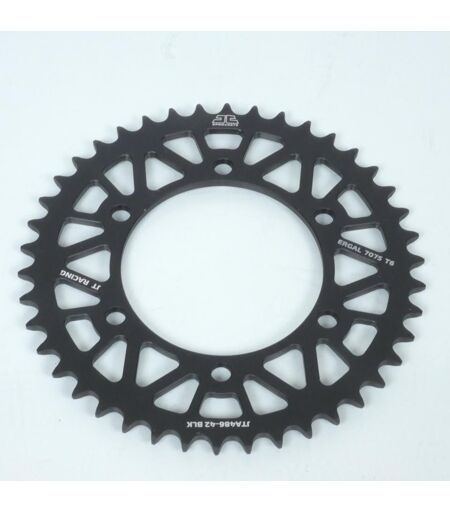 Couronne de transmission arrière neuve de marque JT Sprockets en aluminium coloris noir. Couronne en aluminium aéronautique 7075-T6 haute résistance (Ergal). ATTENTION, le montage de cette couronne nécessite le passage au pas de 520 sur certaines motos. Caractéristiques : - Version couronne : Ultra-light - Type de couronne : 486 - Nombre de dents : 42 dents - Pas de chaine : 520 - Alésage (diamètre intérieur) : 110mm - Nombre de trous de fixation : 6 - Diamètre des trous de fixation : 10.5mm - Entre axe des trous de fixation : 130mm - Épaisseur au niveau des dents : 5.8mm - Déport : 0mm Vendue à l'unité. Livrée conforme à la photo. ...