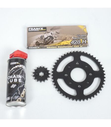 Kit chaîne de transmission neuf de marque France Équipement (démultiplication origine). Ce kit chaîne comprend : - Une couronne en acier de 48 dents, alésage 58mm, quatre trous Ø8.5mm entre axe 90mm et quatre trous Ø10.5mm entre axe 90mm - Un pignon de 14 dents diamètre intérieur 16/20mm - Une chaine grise renforcée 120 maillons au pas 428 - Une attache rapide - Une bombe de graisse chaîne Vendu nu à l'unité. Livré conforme à la photo. ...