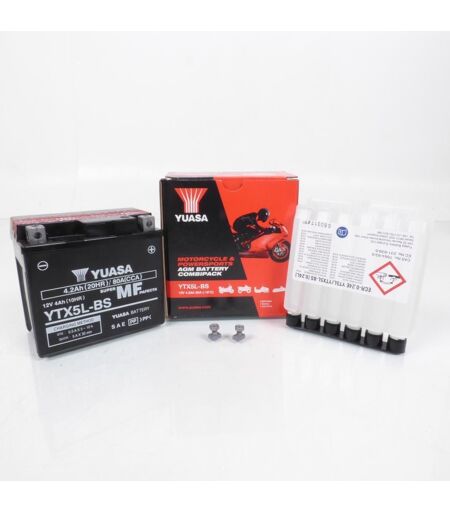 Batterie Yuasa acide conventionnelle au plomb neuve sans entretien vendue avec acide référence YTX5L-BS. Caractéristiques: - Longueur: 114mm - Largeur: 71mm - Hauteur: 106mm - Tension: 12V - Capacité: 4Ah - CCA: 60A - Bornes + à droite - Volume acide: 0.24L La batterie YUASA est très souvent utilisée en monte d'origine par les constructeurs. Elle est reconnue pour sa qualité et sa durée de vie exceptionnelle. Choisir Yuasa, c'est opter pour la tranquillité. Vendue à l'unité. Livrée conforme à la photo. ...