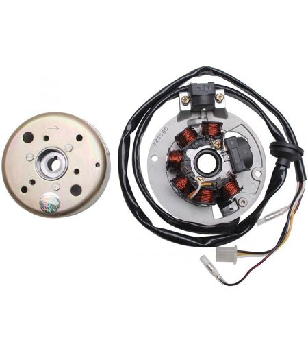 Kit stator et rotor d'allumage neuf adaptable de marque P2R équipé de son capteur d'allumage externe et de sa platine. Caractéristiques : - Stator : 6 pôles + 1 - Diamètre extérieur stator : 80mm - Diamètre intérieur stator : 27/28mm - Entre axe fixation stator : 38mm - Épaisseur au niveau des têtes de bobines : 25/35mm - Épaisseur totale (stator + platine) : 39mm - Connexions : 1 connecteur à 3 bornes et 2 fils à cosses ronde - Longueur câbles : 95/105cm - Diamètre extérieur platine : 118mm - Diamètre intérieur platine : 22.5/26mm - Entre axe fixation platine : 104mm - Diamètre des trous de fixation platine : 6.3mm - Diamètre intérieur volant magnétique : 81.5mm - Diamètre extérieur volant magnétique : 101mm - Épaisseur totale volant magnétique : 38mm - Filetage pour arrache volant mâle : M27x1.0L à gauche (inversé) - Équipé de trois trous filetage M6x1.0 std entre axe 42mm ...