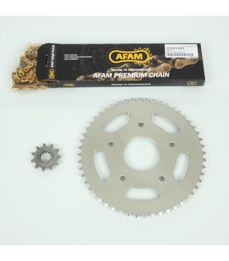 Kit chaîne de transmission complet neuf de marque France Équipement (démultiplication diffèrente de l'origine). Ce kit chaîne comprend : - Un pignon de 11 dents Ø17.2/20.3mm. - Une couronne en acier de 52 dents, alésage 62mm, 5 trous Ø8.5mm entre axe 108mm. - Une chaîne AFAM sans joints toriques 132 maillons au pas 420, coloris or. - Une attache rapide. Livré conforme à la photo. ...