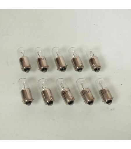 Ampoules blanches BA9s 12V 5W neuves de marque Flösser ergots face à face non décalés. Caractéristiques : - Marque : Flosser - Gamme : Standard - Culot : BA9s - Ergots : face à face non décalés - Tension : 12V - Puissance : 5W - Diamètre du culot : 9mm - Diamètre du verre : 9mm - Longueur totale de l'ampoule : 27mm Vendues par boite de 10. Livrées conforme à la photo. ...