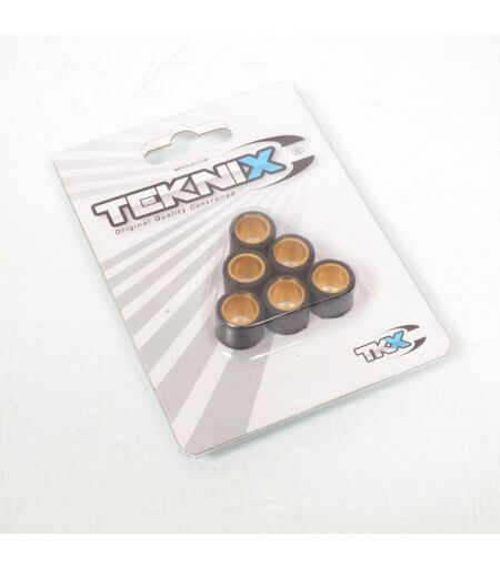 Kit de 6 galets rouleaux de variateur 15x12 neuf de marque Teknix. Caractéristiques : - Diamètre extérieur : 15mm - Largeur : 12mm - Poids : 4.5 grammes - Coloris : Noir Vendus par lot de 6 unités. Livrés conforme à la photo. ...