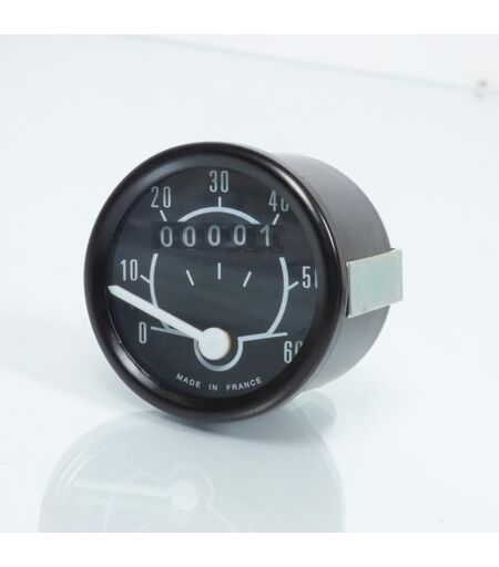 Compteur de vitesse 60Km/h neuf rond équipé de sa patte de fixation. Dimensions: - Diamètre du corps: 48.5mm - Diamètre du cerclage de la vitre du compteur: 52.5mm - Longueur de la partie cylindrique diamètre 48.5mm: 33mm - Longueur hors tout du compteur: 66mm - Longueur totale hors vis de branchement du câble de compteur: 37.5mm Prévu pour cyclomoteur MBK, Peugeot, Solex... Vendu sans câble ni entraineur de compteur. Livré conforme aux photos. ...