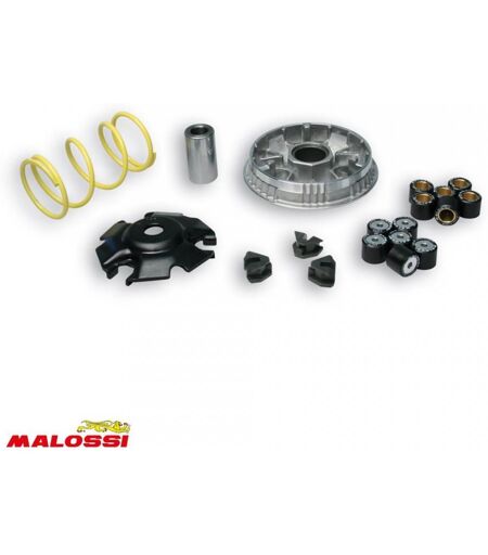Variateur maxi scooter neuf de marque Malossi, modèle Multivar 2000. Le kit Multivar 2000 comprend : - Une joue mobile de variateur - Un plateau d'appui avec ses trois guides - Six galets 10.5g dimensions 20x17mm - Six galets 12.5g dimensions 20x17mm - Un canon de variateur dimensions 15x27x48.8mm - Un ressort de poussée jaune 7.3k dimensions 58.3x105mm (diamètre du fil 4.3mm). Le variateur Malossi Multivar 2000 offre un fonctionnement doux et progressif, ainsi qu'un rendement élevé à la transmission de votre scooter. Tout ce qui est fourni est visible sur la photo. Vendu à l'unité. Livré conforme à la photo. ...