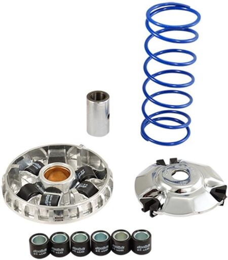 Kit variateur de transmission scooter neuf adaptable de marque Polini modèle Hi Speed référence '241.723'. Ce kit variateur Polini Hi Speed comprend : - Une joue mobile de variateur (Ø114mm) - Un plateau d'appui avec ses trois guides - Un canon de variateur dimensions 17x27x46.5mm - Six galets dimensions 19x17mm x 10grs - Six galets dimensions 19x17mm x 12grs - Un ressort de poussée bleu longueur 145mm au repos Tout ce qui est fourni est visible sur la photo. Vendu nu à l'unité. Livré conforme à la photo. ...