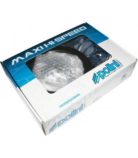 Kit variateur de transmission scooter neuf adaptable de marque Polini modèle Hi Speed référence '241.732'. Ce kit variateur Polini Hi Speed comprend : - Une joue mobile de variateur (Ø126mm) - Un plateau d'appui avec ses trois guides - Un canon de variateur dimensions 20x27x52.5mm - Une rondelle de calage 20x28x5mm - Six galets dimensions 19x17mm x 9grs - Un ressort de poussée bleu longueur 145mm au repos (longueur 40mm sous une poussée de 59Kg) Tout ce qui est fourni est visible sur la photo. Vendu nu à l'unité. Livré conforme à la photo. ...
