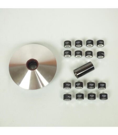 Variateur de transmission scooter neuf adaptable de marque Polini modèle Hi Speed référence '241.636'. Ce kit variateur Polini Hi Speed comprend : - Une joue mobile de variateur (Ø152mm) - Un canon de variateur dimensions 22x31x62.5mm - Huit galets dimensions 25x17mm x 14grs - Huit galets dimensions 25x17mm x 16grs Tout ce qui est fourni est visible sur la photo. Vendu nu à l'unité. Livré conforme à la photo. ...