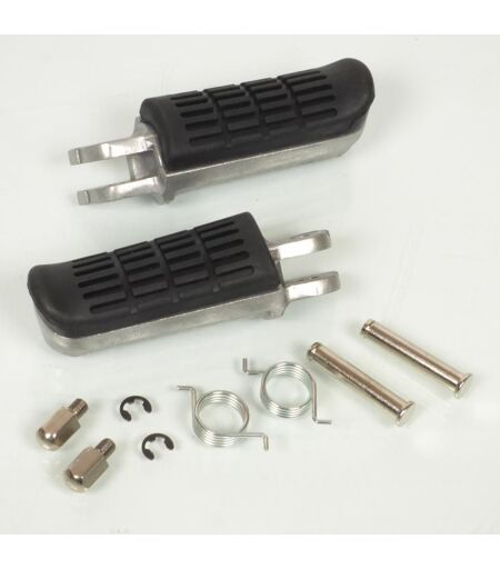 Paire de cale pieds pilote droit et gauche neufs adaptables type Honda, équipés de leurs caoutchoucs, axe et ressort. Dimensions : - Longueur totale : 112mm - Largeur intérieure au niveau de la fixation : 10mm - Largeur extérieure au niveau de la fixation : 22mm - Diamètre du trou de passage de l'axe : 8mm Vendus par paire. Livrés conformes à la photo. ...
