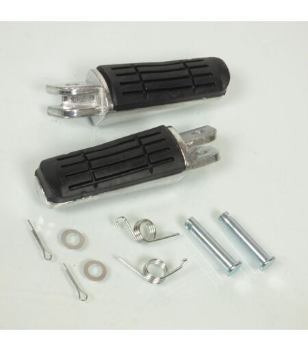 Paire de cale pieds pilote droit et gauche neufs adaptables type Yamaha, équipés de leurs caoutchoucs, axe et ressort. Dimensions : - Longueur totale : 123mm - Largeur intérieure au niveau de la fixation : 7.8mm - Largeur extérieure au niveau de la fixation : 20mm - Diamètre du trou de passage de l'axe : 8mm Vendus par paire. Livrés conformes à la photo. ...