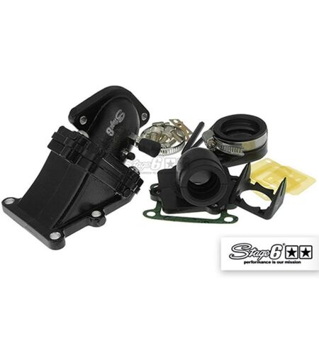 Kit admission neuf de marque STAGE 6 modèle S6-3216800 comprenant boite à clapet et pipe d’admission. Le kit comprend : - Un socle en aluminium - Une boite à clapet - Une pipe en aluminium avec prise de dépression et raccord caoutchouc ainsi que son collier de serrage. - Une pipe en caoutchouc pour montage souple avec son collier de serrage. - La visserie - un joint papier. dimensions : - Entre axe de fixation du support en alu : 58mm en longueur 35mm en largeur. - Diamètre intérieur du raccord caoutchouc coté carburateur : 34mm . - Diamètre intérieur de la pipe caoutchouc coté carburateur : 23.5mm. Vendu le kit à l'unité Livré conforme à la photo. ...