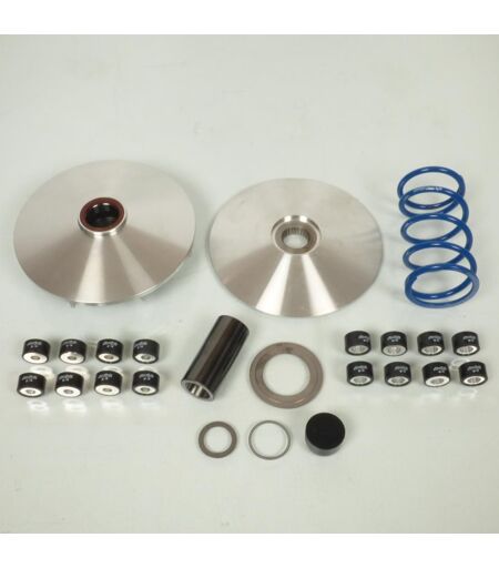 Kit variateur de transmission scooter neuf adaptable de marque Polini modèle Hi Speed Evolution référence '241.744'. Ce kit variateur Polini Hi Speed comprend : - Une joue mobile de variateur (Ø183mm) - Une joue fixe de variateur (Ø183mm) - Un canon de variateur dimensions 25x35x75.3mm - Huit galets dimensions 25x15mm x 12grs - Huit galets dimensions 25x15mm x 14grs - Un ressort de poussée bleu longueur 125mm au repos (longueur 65mm sous une poussée de 94Kg) - Un ressort de joint spi Ø35mm Le nouveau variateur HI-SPEED EVOLUTION est un vrai chef-d’?uvre de technologie et recherche. Dans le kit Hi Speed Evolution la demi poulie fixe et la demi poulie mobile « Air Speed », avec différents degrés pour permettre au ressort d’augmenter la pression. Le ressort de poussé, système anti torsion Evo Slider, a une charge majorée de 15%, 2 séries de galets à l’intérieur de l’emballage avec un grammage plus léger. Le système de ...