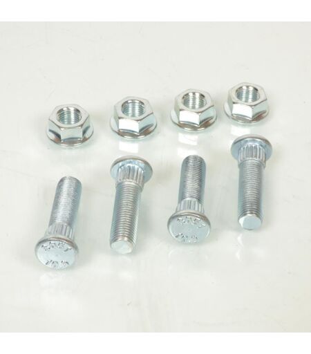 Kit de 4 boulons à nervures, goujons de roue neuf adaptable de marque Moose Racing équipés de leurs écrous. Caractéristiques goujons (85-3051) : - Longueur totale : 37mm - Longueur sous tête : 34mm - Diamètre tête : 16mm - Diamètre filetage : 3/8' (9.4mm) - Filetage Pas anglais (whitworth 55°) : 24G - Longueur filetage : 27mm - Longueur cannelure : 7mm - Diamètre cannelure : 10/10.7mm Caractéristiques écrous : - Hexagonal : 14mm - Diamètre collerette : 19mm - Épaisseur : 8.8mm Livrés conformes à la photo. ...