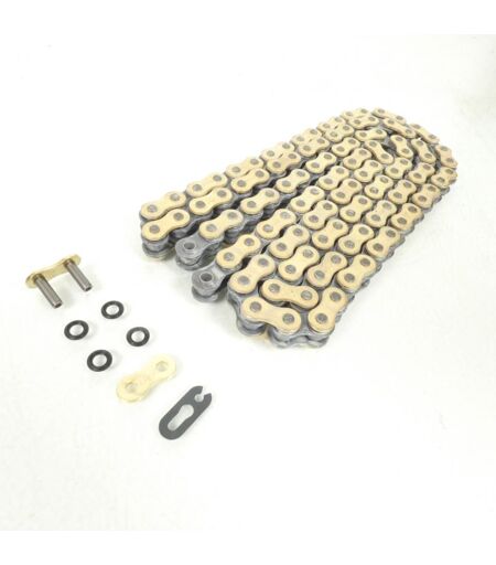Chaîne de transmission renforcée XS-RING à joints toriques de marque AFAM neuve en acier de coloris or. Caractéristiques : - Pas : 520. - Nombre de maillons : 112. - Type attache chaine de transmission : attache rapide avec 4 joints toriques. - Qualité type : Renforcée XS-RING. Vendue à l'unité avec 1 maillon attache rapide et 4 joints toriques. Livrée conforme à la photo. ...