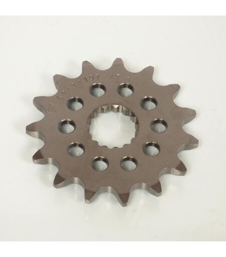 Pignon de sortie de boîte 15 dents neuf adaptable de marque Esjot en acier coloris gris. Caractéristiques : - Nombre de dents : 15 dents - Pas de chaine : 520 - Diamètre sur cannelure : 22mm - Diamètre entre cannelures : 25mm - Nombre de cannelures : 15 - Épaisseur : 6mm - Déport : Non - Trou pour le capteur de vitesse : Non Vendu nu à l'unité. Livré conforme à la photo. ...