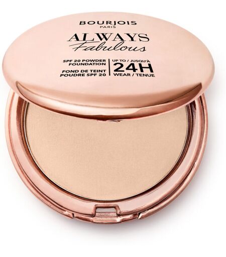 Soyez toujours fabuleuse avec le Fond de Teint Poudre Always Fabulous de Bourjois, la marque française emblématique de produits cosmétiques et de parfums.• Cette poudre 2-en-1 incontournable crée un fini mat effet seconde peau tellement léger que vous oublierez même que vous la portez et associe la couvrance longue tenue d'un fond de teint liquide au pouvoir matifiant d'une poudre.• La formule de ce fond de teint poudre tient toute la journée et est enrichie en acide hyaluronique pour une hydratation supplémentaire, en lipochromane pour ses propriétés anti-pollution et en SPF 20 pour la protection UV.• Disponible en 8 teintes, cette poudre n'assèche pas la peau, ne file pas entre les ridules et offre un magnifique effet flouté et perfecteur qui camoufle les imperfections et contrôle la brillance.• Facile à appliquer, le Fond de Teint Poudre Always Fabulous se présente dans un sublime écrin en or rose avec miroir intégré, donc idéal à glisser dans votre sac à main, et avec un applicateur éponge polyvalent qui permet d'appliquer le fond de teint et de faire des retouches à tout moment de la journée.• La couvrance magnifique de ce fond de teint Bourjois est facilement modulable (moyenne à haute), pour vous accompagner du matin jusqu'au soir. ...