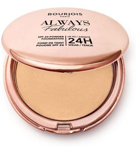 Soyez toujours fabuleuse avec le Fond de Teint Poudre Always Fabulous de Bourjois, la marque française emblématique de produits cosmétiques et de parfums.• Cette poudre 2-en-1 incontournable crée un fini mat effet seconde peau tellement léger que vous oublierez même que vous la portez et associe la couvrance longue tenue d'un fond de teint liquide au pouvoir matifiant d'une poudre.• La formule de ce fond de teint poudre tient toute la journée et est enrichie en acide hyaluronique pour une hydratation supplémentaire, en lipochromane pour ses propriétés anti-pollution et en SPF 20 pour la protection UV.• Disponible en 8 teintes, cette poudre n'assèche pas la peau, ne file pas entre les ridules et offre un magnifique effet flouté et perfecteur qui camoufle les imperfections et contrôle la brillance.• Facile à appliquer, le Fond de Teint Poudre Always Fabulous se présente dans un sublime écrin en or rose avec miroir intégré, donc idéal à glisser dans votre sac à main, et avec un applicateur éponge polyvalent qui permet d'appliquer le fond de teint et de faire des retouches à tout moment de la journée.• La couvrance magnifique de ce fond de teint Bourjois est facilement modulable (moyenne à haute), pour vous accompagner du matin jusqu'au soir. ...