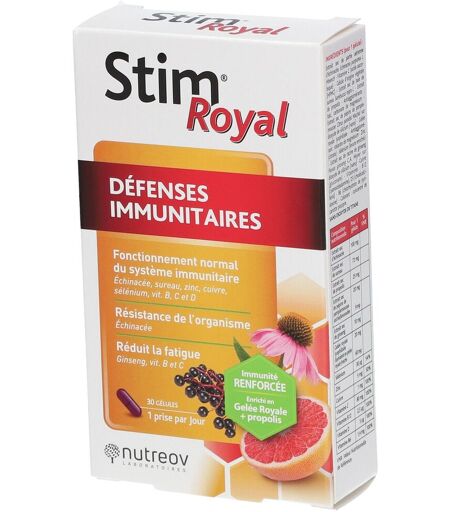 Complément alimentaire à utiliser dans le cadre d’une alimentation variée, équilibrée et d’un mode de vie sain.Notre système immunitaire est normalement capable de faire face aux agressions extérieures pour défendre notre organisme. En hiver, celui-ci est davantage sollicité et peut être amoindri par de nombreux facteurs (le stress, les déficits nutritionnels, l’âge…). Stim® Royal Défenses Immunitaires Gélules, issu de la recherche des laboratoires Nutreov, inspirée par la nature, présente une formule synergique unique, comprenant notamment des produits naturels issus de la ruche, tels que la gelée royale et la propolis, reconnus pour leurs bienfaits. Cette association innovante vous aidera à passer un hiver serein.Bénéfices:Contribue au fonctionnement normal du système immunitaire grâce aux extraits d’échinacée, de sureau, au zinc, cuivre, sélénium et aux vitamines B, C et DContribue à la résistance de l’organisme grâce aux extraits d’échinacéeRéduit la fatigue à l’aide des extraits de ginseng et des vitamines B et CComposition:Extrait sec de partie aérienne d’échinacée Echinacea purpurea L. Moench – Vitamine C (acide ascorbique) – Gélule d’origine végétale (HPMC) – Extrait sec de baie de sureau Sambucus nigra L. – Extrait de propolis – Antiagglomérants : talc, carbonate de magnésium – Extrait sec de pépins de pamplemousse Citrus paradisi Macfad sur dioxyde de silicium [nano] – Gelée royale lyophilisée – Antiagglomérant : stéarate de magnésium – Zinc (citrate) – Sélénium (levure enrichie) – Extrait sec de racine de ginseng Panax ginseng C.A Meyer sur dioxyde de silicium [nano] – Cuivre (gluconate) – Vitamines : B12 (cyanocobalamine), D3 (cholécalciférol), B6 (chlorhydrate de pyridoxine) – Colorant : concentré de carotte pourpre.Valeur nutritionnelle: Pour 1 géluleAJR*Extrait sec d’échinacée100 mg Extrait sec de sureau72 mg Extrait sec de propolis25 mg Extrait sec de pépins de pamplemoussesoit biolflavonoides20 mg9 mg Extrait sec de ginseng10 mg Gelée royale lyophiliséeÉquivalent en gelée royale fraîche20 mg60 mg Sélénium30 μg54%Zinc5 mg50%Cuivre1 mg100%Vitamine C80 mg100%Vitamine B122,5 μg100%Vitamine D5 μg100%Vitamine B61,4 mg100%*Apport journalier de RéférenceConseil d'utilisation:1 gélule par jour pendant 1 mois à renouveler.Précautions d'emploi:Ne convient pas aux enfants, adolescents en croissance, aux femmes enceintes ou en période d’allaitement. Garder hors de portée des jeunes enfants. Contient de l’échinacée : déconseillé en cas de maladies auto-immunes et immunodéficientes et aux personnes allergiques aux astéracées. À consommer de préférence avant la date indiquée sur l’étui. Ne pas dépasser la dose journalière recommandée. À conserver au frais, au sec et à l’abri de la lumière.Poids net:15,7 g = 30 gélulesFabricant:NUTREOV PHYSCIENCE5 avenue Louis Blériot63000 clermont Ferrand ...