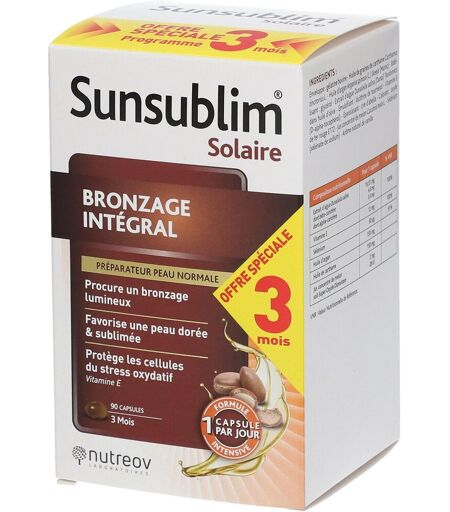Complément alimentaire à utiliser dans le cadre d’une alimentation variée, équilibrée, d’un mode de vie sain. Envie d’un beau bronzage ? Il faut s’y préparer. Le bronzage est un mécanisme de protection de l’organisme face au soleil, en produisant entres autres de la mélanine, un pigment dont le rôle est d’absorber les rayons du soleil, mais il est aussi esthétique ! Issu de la recherche des laboratoires Nutreov, inspirée par la nature, Sunsublim® Solaire Bronzage Intégral est un préparateur solaire nouvelle génération, qui procure un bronzage éclatant et protège la peau. Bénéfices: Procure un bronzage lumineux, grâce aux caroténoïdes d’origine végétaleNourrit la peau grâce au extraits d’huile d’argan Protège les cellules du stress oxydatif à l’aide de la vitamine Composition:Enveloppe : gélatine bovine – Huile de graines de carthame Carthamus tinctorius L. – Huile d’argan Argania spinosa (L.) Skeels – Stabilisant : glycérol – Extrait d’algue Dunaliella satina (Dunal) Teodoresco dans huile d’olive – Émulsifiant : lécithine de tournesol – Vitamine E (D-al-pha-tocophérol) – Épaississant: cire d’abeille- Colorant: oxyde de fer rouge E172 – Extrait de melon Cucumis melo L. – Sélénium (sélénate de sodium) – Arôme naturel de vanille. Valeur nutritionelle: Pour 1 capsule AJR* Extrait d’algue Dunaliella salina dont : bêta-carotène alpha-carotène 19,55 mg 4,8 mg 0,4 mg 100% Vitamine E 12 mg 100% Sélénium 50 µg 91% Huile d’argan 150 mg Huile de carthame 150 mg Extrait de melon 2 mg *Apport journalier de référence Conseil d'utilisation:Prendre 1 capsule par jour au cours d'un repas avec un grand verre d'eau. À prendre minimum 15 jours avant, pendant et après l'exposition, pour prolonger le bronzage. Précautions d'emploi:Ne convient pas aux enfants et adolescents encore en croissance, aux femmes enceintes ou en période d’allaitement. Déconseillé aux fumeurs. Garder hors de portée des jeunes enfants. Ne pas dépasser la dose journalière recommandée. À consommer de préférence avant la date indiquée sur l’étui. À conserver au frais, au sec et à l’abri de la lumière. Sunsublim® n’arrête pas les rayons U.V. Il est indispensable de protéger sa peau du soleil en utilisant une crème protectrice lors des expositions. Poids net:51,3 g = 90 capsules Fabricant:Laboratoires Nutreov Physcience5 Avenue Louis Blériot63000 Clermont Ferrand ...
