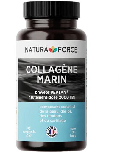 Collagène marin (90 caps) de la marque française Natura Force est un complément alimentaire à base de collagène marin hydrolysé. Le collagène est une protéine structurale. On la retrouve dans les cartilages, les os, la peau mais aussi au sein des muscles. Le collagène favorise la santé des os, hydrate et assure le bon fonctionnement de la peau. L'hydrolysat de collagène du produit de Natura Force est issu de poisson et il a de nombreux bénéfices sur l'organisme. Pour éviter les douleurs articulaires associées à l'arthrose, l'arthrite ou l'ostéoporose, Natura Force privilégie une forte présence d'hydrolysats de collagène marin à hauteur de 2000 mg (1 dose = 3 comprimés). En effet, le collagène est primordial pour la santé articulaire car il est un des acteurs principaux de la solidité des os, de l’élasticité des tendons, des ligaments et du cartilage osseux. Par ailleurs, la présence de la vitamine C (36 mg par dose) renforcera l'immunité du sportif ou du non-sportif. La composition de ce complément alimentaire permet aussi d'assurer un bon fonctionnement de la peau et préserve son hydratation pour lutter contre les signes de l'âge. ...