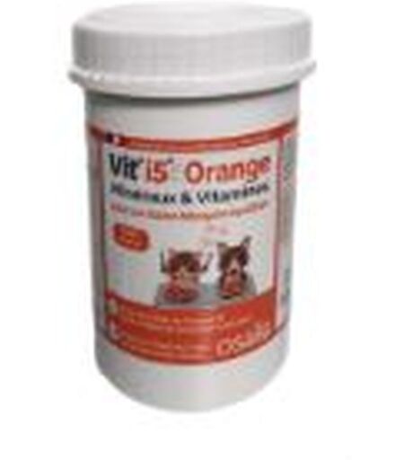 Vit'i5 ORANGE est formulé spécifiquement par un vétérinaire nutritionniste pour équilibrer en minéraux (complément alimentaire minérale), vitamines et oligo-éléments l'alimentation ménagère des chiens et chats = viande/poisson + Vit'i5 + huile de colza + légumes +/- féculent.C'est le seul complément phospho-calcique avec un ratio Ca:P de 3, pour compléter au mieux la ration ménagère :Du chiot et du chaton en pleine croissanceDu chien et du chat adulte en bonne santé, jusqu'à l'âge de 8 ansDes femelles reproductrices : en fin de gestation et en lactation.Une ration ménagère manque de certains minéraux et vitamines, même si le chien ou le chat consomme un peu de fromage, de yaourt ou de lait. Il est indispensable à leur santé de leur apporter Vit'i5 Orange tous les jours.Recommandations nutritionnellesMélanger chaque jour la quantité recommandée avec de la viande ou le poisson. Ne pas cuire ou chauffer Vit'i5.DosagePour les chats et les chiens de moins de 8 ans : 5 ml Vit'i5 + 100 - 150 g (de viande / poisson)Pour les chats et les chiens de plus de 8 ans : passer à Vit'I5 BleuCompositionLevure de bière, Phosphate bicalcique, Carbonate de Calcium, Parois de levures (S. cerevisiae).Constituants analytiquesProtéines brutes : 24 g - Matières grasses brutes : 2 g - Minéraux : 46 g - Fibre brute : ...