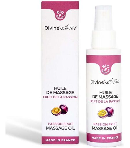 Je suis l'huile de massage gourmande fruit de la passion bio 100 ml de Divinextases (https://www.espaceplaisir.fr/marques/183-divinextases). Une huile hydratante, biologique et comestible conçue par la 1ère marque Bio de cosmétique érotique depuis 2011 ! Transformez vos moments intimes avec votre partenaire en de délicieuses excursions estivales. Mon délicieux goût fruit de la passion vous mènera vers un septième ciel paradisiaque. Appliquez ma formule enrichie en huile d'argan sur le corps de votre partenaire et massez sensuellement avec ma texture hydratante et comestible ! Je rends votre peau soyeuse et nourrie en laissant aucune sensation de film gras puisque je ne contiens pas d'huile minérale. J'ai été conçue dans le plus grand respect de votre intimité : elle ne contient ni paraben, ni phénoxyéthanol, ni colorant, ni huile de palme, ni parfum, ni glycérine. Fabriqué en France, ce produit est labellisé Nature et Progrès. Votre huile de massage n'est pas compatible avec les préservatifs. Ingrédients : helianthus annuus seed oil, argana spinose kernel oil, parfum prophylene, benzyl acetate, tocopherol, amylonnamal, linalool ...