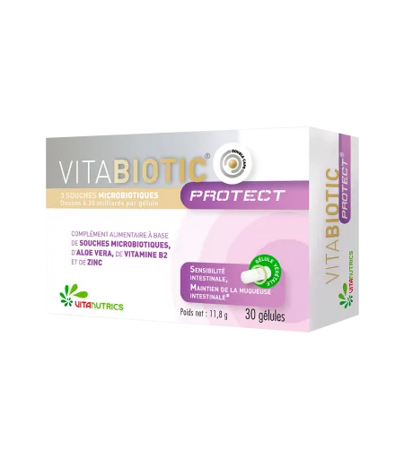Vitabiotic Protect, c’est : - Une association unique de souches microbiotiques et d’Aloe vera, de zinc et de vitamine B2.- 2 gélules équivalent à 200 milliards de bactéries non microencapsulées (technologie Double caps®).- Souches naturellement présentes dans le tractus digestif humain.- Des effets rapides (2 semaines) et significatifs. À prendre en cas de sensibilité intestinale qui peut être provoqué par plusieurs facteurs : - Troubles fonctionnels digestifs (MICI)- Intolérances alimentaires- Sensibilité à certains aliments (fibres, épices, fructose, lactose, alcool, oléagineux…)- Prise de certains médicaments (ibuprofène, IPP, antibiotiques)- Déséquilibre du microbiote- Infections (virus, bactéries, vers, parasites) La technologie Double caps® est un précédé breveté d’encapsulation des micro-organismes. Il protège les souches microbiotiques des sucs gastriques et pancréatiques ainsi que des sels biliaires et permet à 5 fois plus de bactéries d’atteindre le colon (étude sur simple demande). Étui de 30 gélules, soit 15 à 30 jours de traitement. ...
