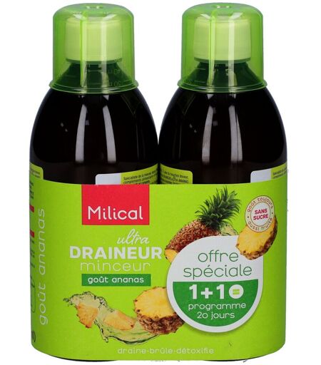 Il est important d'avoir une alimentation variée et équilibrée et un mode de vie sain.Draineur minceur saveur ananas, une formule complète pour une action efficaceLe draineur minceur au goût d'ananas est la solution drainante pour une action minceur réussie, tout en se faisant plaisir, avec un programme de 20 jours ! Milical a sélectionné 5 actifs phares naturels :Thé vertBardaneReine des prèsLamier blancChicoréeSa formule riche en extraits végétaux offre une action complète et efficace.Grâce à son association unique de 5 plantes reconnues pour affiner la silhouette, le draineur minceur Milical a 3 actions : Anti-rétention d'eau : le thé vert, la reine des prés, le lamier blanc et la chicorée favorisent l'élimination de l'eau. Détoxifiante : la bardane et la chicorée facilitent le processus de détoxification de l'organisme. Brûle-graisses : le thé vert contribue à brûler les graisses. Le draineur Ultra Milical est aussi et surtout une formule plaisir déculpabilisante, sans sucre, sans colorant et sans arôme artificiel. Et pour finir, le plus : un goût d'ananas délicat et gourmand, pour une délicieuse boisson exotique et rafraichissante et une silhouette globalement affinée !IngrédientsEau, arôme, extrait sec de racines de bardane* (Arctium lappa) 1% (2100 mg**), extrait sec de sommités fleuries de reine des prés* (Filipendula ulmaria) 1% (2050 mg**), acidifiant : acide citrique, jus concentré d'ananas 0,91%, extrait sec de sommités fleuries de lamier blanc* (Lamium album) 0,51% (1025 mg**), extrait sec de racines de chicorée* (Cichorium intybus) 0,3% (600 mg**), extrait sec de feuilles de thé vert (Camellia sinensis) 0,25% (2525 mg**), conservateur : sorbate de potassium, édulcorants : acésulfame de potassium et sucralose.*sur support maltodextrine.**équivalence plante sèche par dose journalière (8300mg/jour)Valeurs nutritionnelles Analyse nutritionnelle (pour 1 L de boisson reconstituée) Nutriment Quantité Valeur énergétique 5,8 kJ / 1,4 kcal Glucides 0,34 g dont sucres 0 g Protéines 0 g Sel 0 g Conseils d'utilisationVerser 50 mL de draineur minceur Milical dans le bouchon doseur, et les diluer dans 950ml d'eau. A boire tout au long de la journée.Précautions d'emploiL’amincissement ne peut être obtenu que dans le cadre d’une alimentation variée et équilibrée, avec un apport calorique contrôlé et un mode de vie sain. Ne pas dépasser une dose journalière ⩾ à 800 mg d’EGCG. Ne pas dépasser 1L/jour. 1L de boisson reconstituée apporte 47mg d’EGCG/jour. Ne doit pas être consommée à jeun, ni par les femmes enceintes ou allaitantes, ni par les enfants ...
