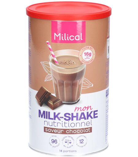 Il est important d'avoir une alimentation variée et équilibrée et un mode de vie sain.Milical vous accompagne grâce à une formule unique qui vous aide à maigrir tout en vous faisant plaisir !Découvrez notre milk-shake saveur chocolat, rafraichissant et hyperprotéiné. Il permet le maintien de la masse musculaire grâce à ses 16 g de protéines par portion. Il contient 6,3 g de fibres ainsi que des vitamines et des minéraux. C'est le plaisir et la gourmandise d'un vrai milk-shake saveur chocolat mais avec une valeur énergétique réduite (-33%*) et une teneur amoindrie en sucres (-84%*). BénéficesEn repas savoureuxEn pauses gourmandesAvant ou après une activité physiqueIngrédientsProtéines de LAIT, cacao maigre en poudre 12,6%, LAIT écrémé en poudre, inuline, fructo-oligosaccharides, minéraux (magnésium, potassium, calcium, fer, zinc), épaississant (gomme cellulosique), arôme (colorant : caramel ammoniacal), émulsifiant (lécithines de SOJA), arôme, sel, édulcorants (acésultame-K, aspartame), vitamines (C, E, A, B6, D, B1, B2, B9).Allergènes : Soja, Lait.Valeurs nutritionnellesÉlémentPour 30g de poudre + 200ml d'eauValeur énergétique406 kJ / 96 kcalMatières grasses0,6 gdont acides gras saturés0,3 gGlucides3,6 gdont sucres2,3 gFibres alimentaires6,3 gProtéines16 gSel0,90 gVitamine A285 µgVitamine D1,8 µgVitamine E4,2 mgVitamine C28 mgVitamines B10,66 mgVitamine B20,66 mgVitamines B60,69 mgVitamine B978,0 µgCalcium285 mgMagnésium143 mgFer6,6 mgZinc4,2 mgPrécautions d'emploiEn remplacement d'une partie de votre repasIls ne peuvent être consommés comme seule source d'alimentation mais doivent être associés aux aliments traditionnels.Il convient de maintenir une consommation d'eau suffisante au cours de la journée (1,5 à 2 litres).Les régimes amaigrissants sans surveillance médicale sont particulièrement déconseillés aux enfants, aux adolescents encore en croissance, aux femmes enceintes ou allaitantes et aux personnes âgées.Poids net14 portionsAdresse du FabricantLaboratoires Jaldes - Milical1132 rue de la Castelle34070 Montpellier ...