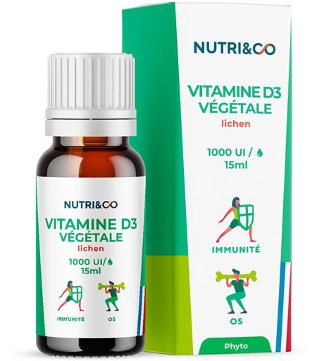 Complément alimentaire à utiliser dans le cadre d’une alimentation variée, équilibrée et d’un mode de vie sain.Vitamine D bio-identique : le Cholécalciférol ou Vitamine D3Sous forme de D3 (cholécalciférol), la vitamine D est largement plus efficace que la forme D2 (ergocalciférol). Une vitamine D exclusivement végétaleSi elle est essentiellement présente dans le règne animal et souvent extraite de laine de mouton, elle peut également être extraite du Lichen Boréal. C'est une des rares exceptions à la règle et cela nous permet de vous proposer une vitamine 100% végétale.IngrédientsHuile vierge de colza, Vitamine D3 végétale issue du lichen, antioxydant : extrait riche en tocophérols.Valeurs nutritionnellesIngrédientPour 1 goutteAR*Vitamine D3 (Cholécalciférol) issue de Lichen1000 UI soit 25 μg500%Huile vierge de Colza bio (Brassica napus L)39,2 mg-Conseils d'utilisation1 à 2 gouttesPrécautions d'emploiConserver dans un endroit sec et à l’abri de la lumière et de la chaleur.À tenir hors de portée des enfants.Poids net15 mlAdresse du FabricantNUTRI & CO SAS9 Cours des Arts et Métiers 13100 Aix-en-Provence ...