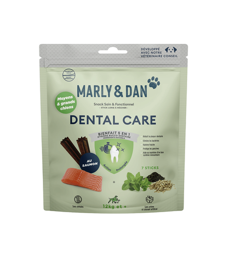 Sticks dentaires pour grands chiens – Hygiène bucco-dentaire complète, 7 sticks, goût saumon Pensés pour les chiens de moyenne à grande taille, les sticks Marly & Dan Dental Care allient mastication longue durée et soin bucco-dentaire complet. Leur recette fonctionnelle au saumon est enrichie en plantes et extraits naturels pour renforcer l’hygiène, la digestion et le bien-être général des chiens de plus de 12 kg. Une formule complète pour des dents propres et une haleine fraîche Ces sticks ont été développés avec des vétérinaires pour offrir une action 5 en 1 : Réduction de la plaque dentaire , Protection contre le tartre et les maladies des gencives, Rafraîchissement de l’haleine , Soutien du système immunitaire et de la digestion , Apport en nutriments essentiels pour une santé globale renforcée. Des ingrédients fonctionnels, sans céréales La recette associe : 26 % de saumon : source d’Oméga 3, protéines et nutriments pour les muscles, le pelage et les défenses naturelles, Graines de fenouil : pour une digestion apaisée et une haleine plus fraîche, Menthe poivrée : action désodorisante naturelle, Persil : riche en vitamines et antioxydants, soutient la santé des reins, du foie et des gencives, Extrait de thé vert : antibactérien, protège les gencives et limite la mauvaise haleine. Sans céréales, sans colorants ni conservateurs artificiels, ces sticks conviennent parfaitement aux chiens ayant une alimentation sensible. Un format adapté aux grandes mâchoires La taille et la densité de ces bâtonnets sont spécialement étudiées pour convenir aux chiens de plus de 12 kg. Ils encouragent la mastication prolongée, ce qui favorise naturellement le nettoyage des dents tout en apportant un moment de détente et de plaisir gustatif. Une gamme fonctionnelle pour chaque besoin La version Dental Care existe aussi en format petit chien (5–12 kg), et s’intègre dans une collection bien-être développée par Marly & Dan . A découvrir également : Calme : pour apaiser les tensions, Articulations : pour préserver la mobilité, Digestion : pour un confort intestinal durable, Vitalité 100 % Saumon : pour un regain d’énergie naturel, Mobilité Saumon : pour renforcer les articulations en douceur. Ajoutez les sticks Marly & Dan Dental Care à la routine bien-être de votre grand chien. Commandez dès aujourd’hui sur la boutique Médor et Compagnie® et explorez tous nos produits dédiés à la santé, à la nutrition et à l’hygiène bucco-dentaire de votre compagnon ! ...