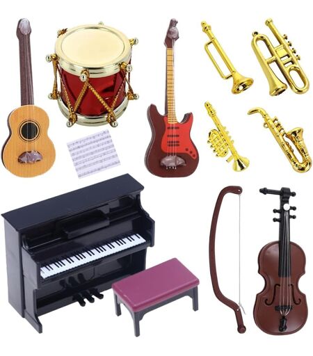 Instruments De Musique MiniaturesLa décoration d'instruments de musique miniatures pour maisons de poupées d'enfants contient 12 petits instruments de musique magnifiquement fabriqués,dont 1 piano, 1 tabouret de piano, 1 partition, 1 violons et archets, 1 guitare classique, 1 guitare électrique, 1 batterie, 1 saxophone, 1 trompette, 1 clarinette, 1 alto.TaillesLe piano mesure 9cm de long, 7cm de haut, 3,8cm de large, le banc du piano mesure 4cm de long, 2,5cm de large, 2cm de haut, les notes mesurent 2,5cm de long, 2,3cm de large, le violon mesure 8cm de long, 3cm de large, l'archet mesure 8,5cm de long, 2,5cm de large, la guitare classique mesure 6,5cm de long, 2,2cm de large, la guitare électrique mesure 6,5cm de long, 2,2cm de large, la batterie mesure 3,5cm de diamètre et 2,2cm de haut. 3cm, la longueur du saxophone 4,6cm, la trompette 4,5cm, la clarinette 4,6cm, l'alto 4,5cm.Matériaux DurablesMini instruments de musique est fait de plastique,Robuste, fiable durable, léger et stable,Jouer avec ces beaux accessoires de maison de poupée ne sera pas seulement amusant, il permettra de développer votre imagination, la créativité, la dextérité ou la coordination main et ?il,un ensemble complet pour décorer votre ?uvre d'art.Design RéalisteNos accessoires pour maisons de poupées miniatures se caractérisent par des détails exquis et des couleurs réalistes, ajoutant une touche d'authenticité aux salons, chambres, salles à manger et bureaux des maisons de poupées. Grâce à leur légèreté, ils sont faciles à installer et à transformer, ce qui vous permet de personnaliser votre maison de poupées en toute simplicité.Une Large UtilisationQue ce soit pour Noël, un anniversaire, le Nouvel An ou un cadeau de fête,ces instruments de musique miniatures constituent un cadeau unique et bien pensé,parfait pour décorer le salon, la chambre à coucher, la salle à manger, le bureau, la salle de bain, la salle de jeux et bien d'autres endroits de la maison de poupées!.La livraison depuis la France est prévue dans 5 jours ouvrés, n'hésitez pas à passer votre commande ...