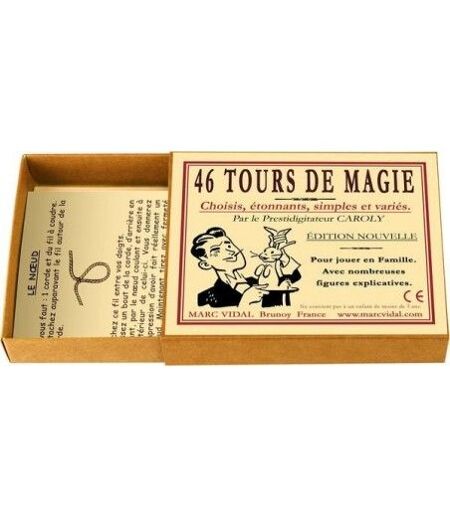 Voici 46 tours de magie simples, variés et étonnants, une idée de cadeau originale signé; Marc Vidal, spécialiste des jeux et jouets de notre enfance. Les tours de magie sont expliqués par le prestidigitateur Caroly et avec de la ficelle, des cartes, des jetons, des pièces ... ; Tout ce qu'il faut pour passer des moments magiques pour; les petits comme les grands ! Dimensions de la boite : 10 x 8 x 2 cm ...