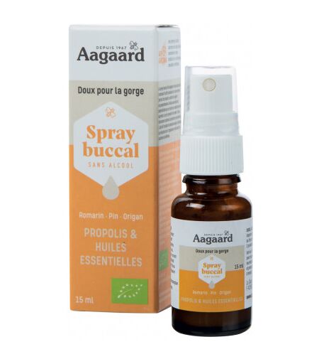Aagaard Spray Buccal propolis BIO sans alcool 15 ml Propolis, Extrait de pépins de pamplemousse, Huiles essentielles Niaouli, Pin Sylvestre, Origan