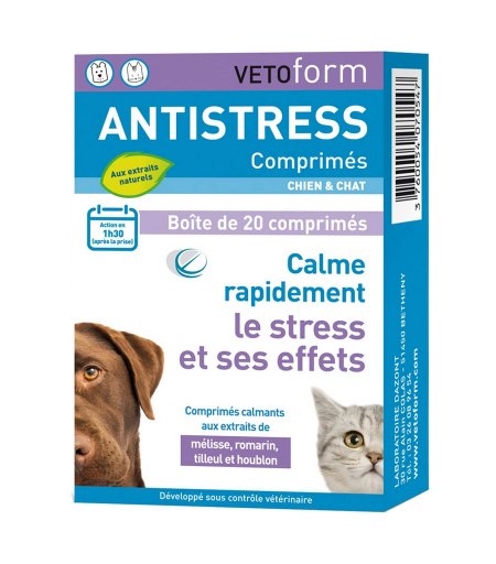Parapharmacie > Vétérinaire > Bien-être animal > Compléments alimentaires animaux Vetoform Antistress Chien et Chat Comprimés x 20 - Compléments alimentaires animaux - Pharmacie en ligne LaSante.net